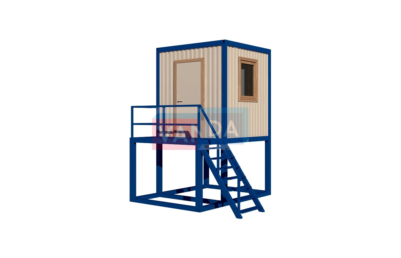 Пост охраны на подиуме №2 (вариант 3) изготавливается из несущего каркаса (верхняя и нижняя обвязка): швеллер 100х50х3 мм., угловые стойки: сложно - гнутый угол 90х90х3 мм., крыша блок-контейнера: металл сварной 0,9-1 мм., качественная наружная отделка: оцинкованный профлист, вспомогательный деревянный каркас (стены) выполнен из брусок 40х75 мм., лаги пола: обрезная доска 40х100 мм., лаги потолка: обрезная доска 40х100 мм., выполнено утепление: Минеральная вата «ISOVER» – 50 мм. и пароизоляция: плёнка техническая, черновой пол состоит из: обрезная доска 20 мм. (2 сорт), чистовой пол покрыт: ДСП строительное 16 мм., отделка пола выполнена из качественных материалов. Контейнер комплектуется окнами: деревянное, двойное остекление 800х1000, входной дверью: ДГ 21-8 обшита снаружи оцинкованным листом, врезной замок и внутренними дверями. Если в БК присутствуют перегородки, то для них используется: брусок 40х50 мм. Лестница постамента имеет перила, тетива лестницы выполнена из профтрубы 30х60 мм., ступени из уголка 25х25х3 мм., просечной лист, перила из профтрубы 20х40 мм., площадка перед входной дверью имеет ограждение.